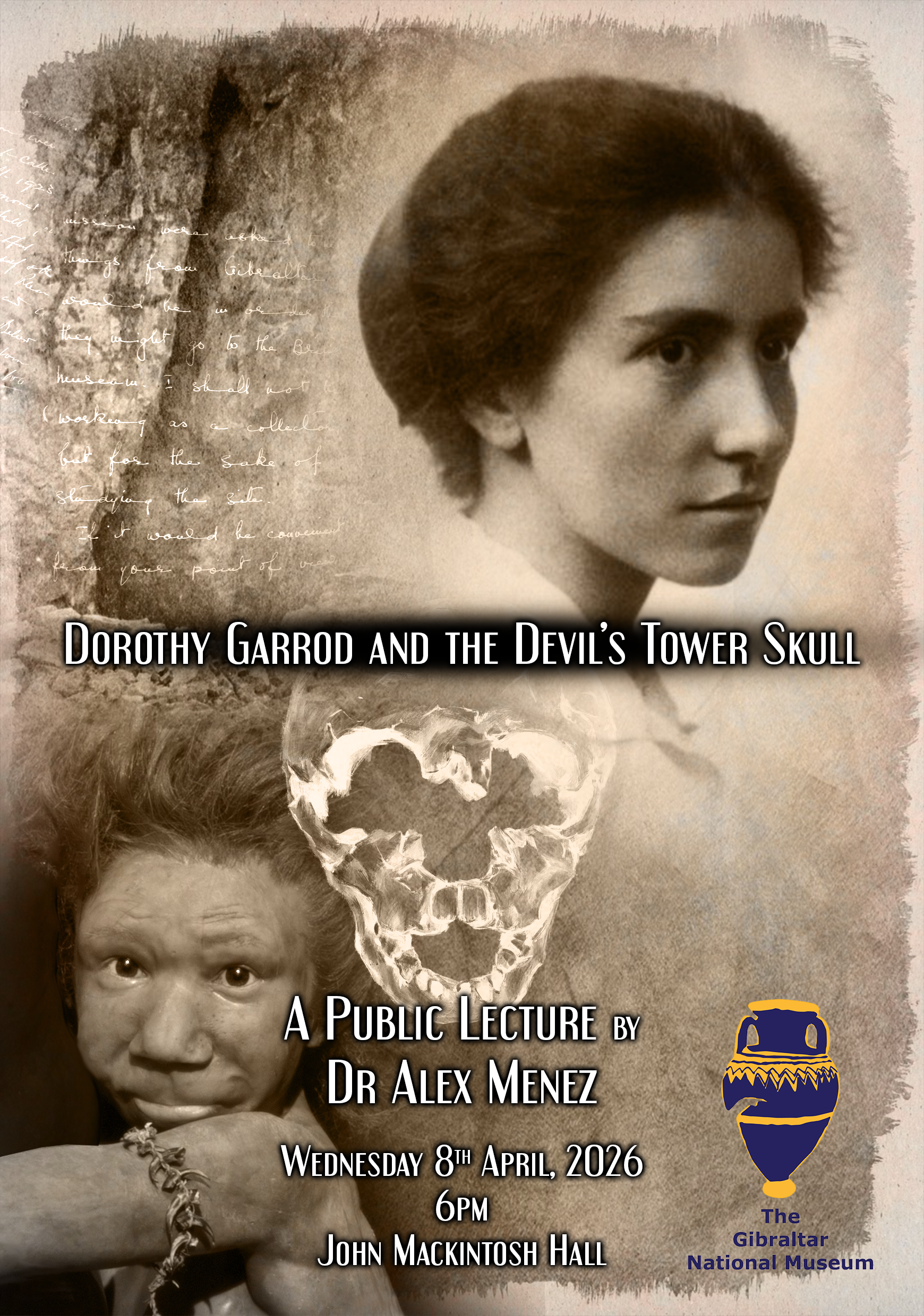 For over thirty millennia, the Rock of Gibraltar concealed a wonderful secret. 100 years ago, that secret came to light. The archaeologist, Dorothy Garrod, had found the skull of a Neanderthal child. This year we celebrate this discovery: The Devil’s Tower Skull, also known as Flint. In this talk Dr Menez will focus on the discovery, Dorothy Garrod, and Flint.