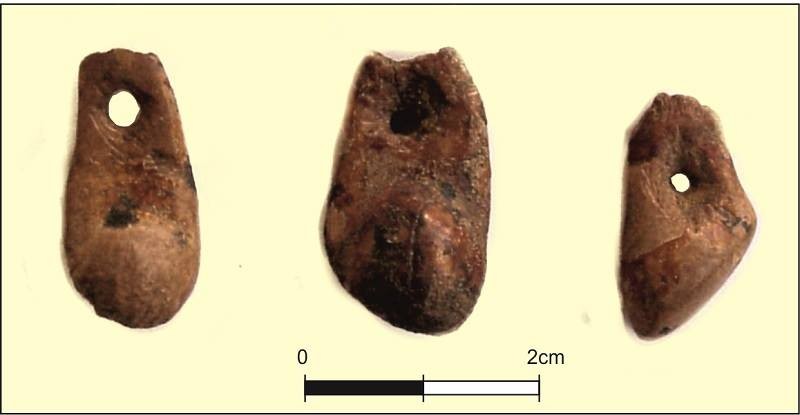 By analysing the cut marks around the perforations and with the aid of experimental archaeology, it has been possible to identify the different perforation methods employed. In this case we find that the teeth were perforated on just one side and on the root end. Pressure would have been applied with a pointed stone tool with a rotational movement to drill into the teeth and achieve the necessary holes to hang them as pendants.